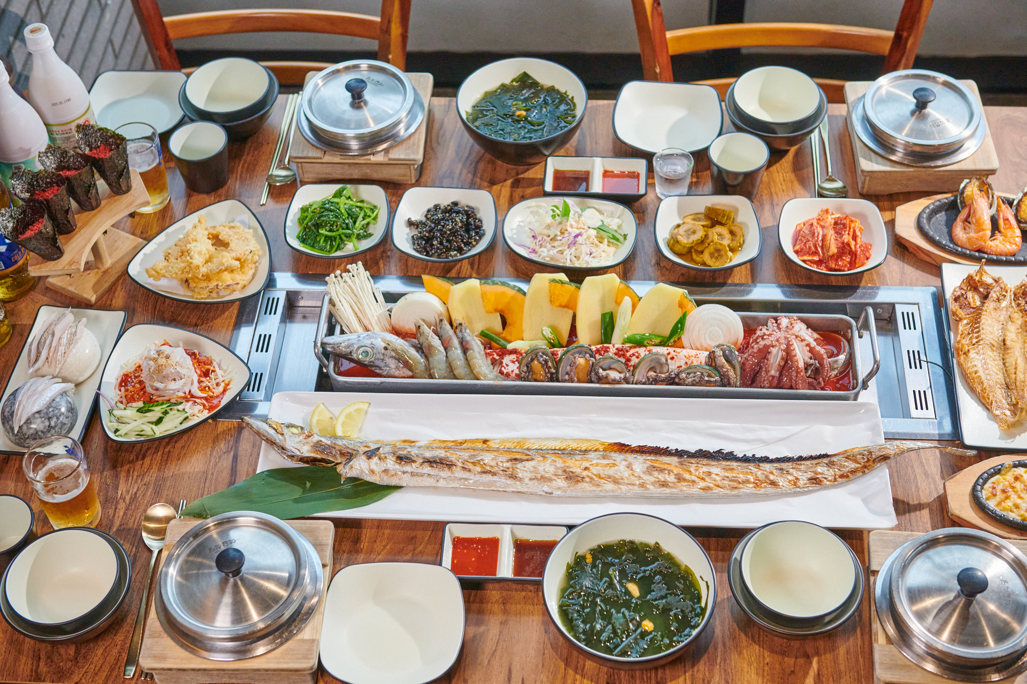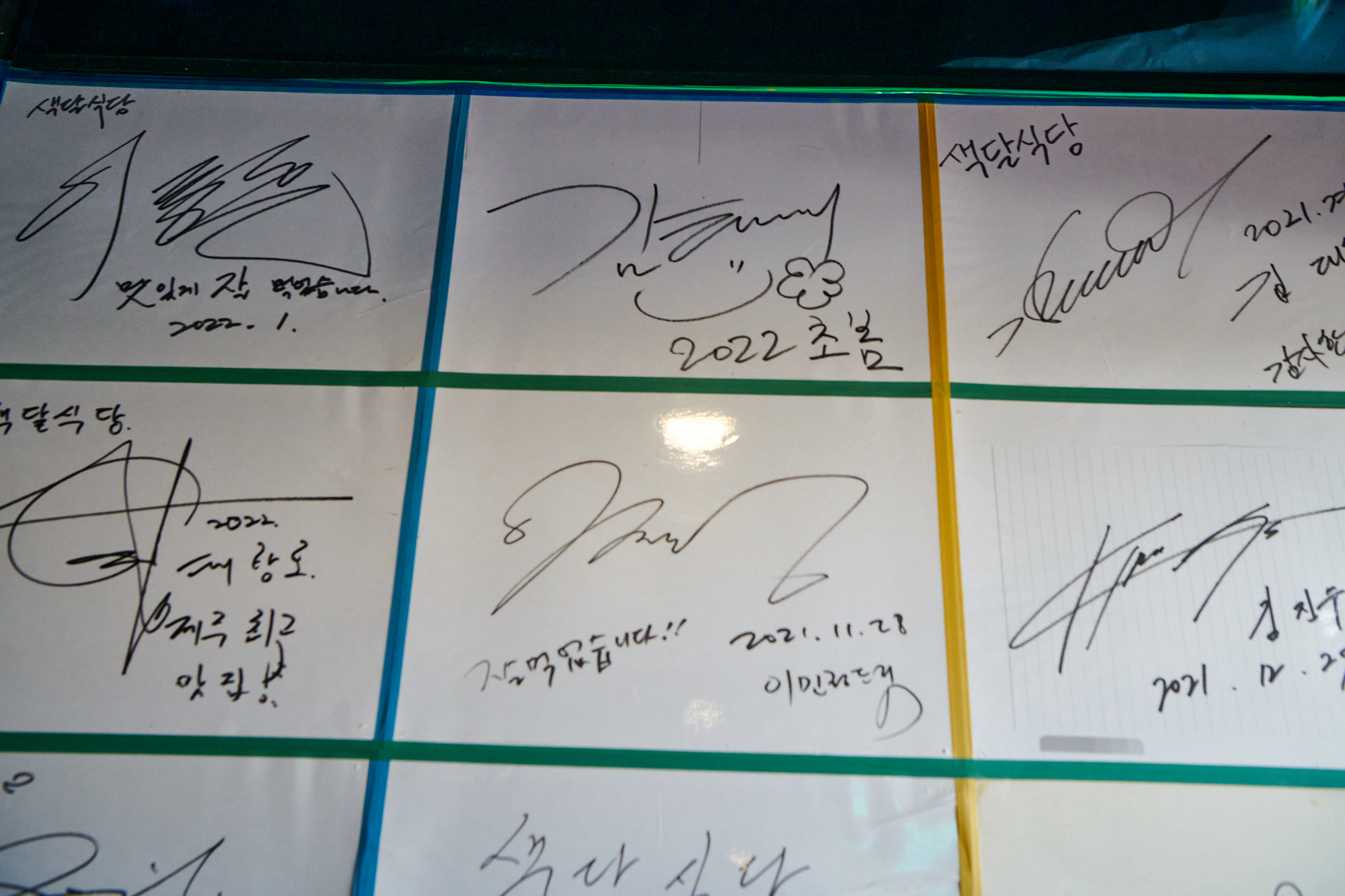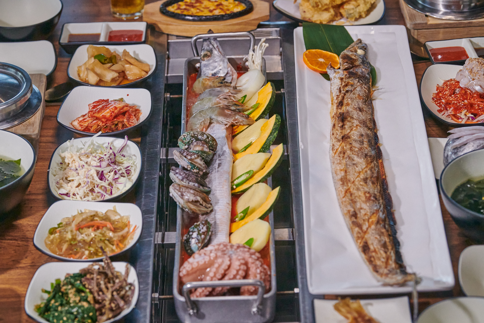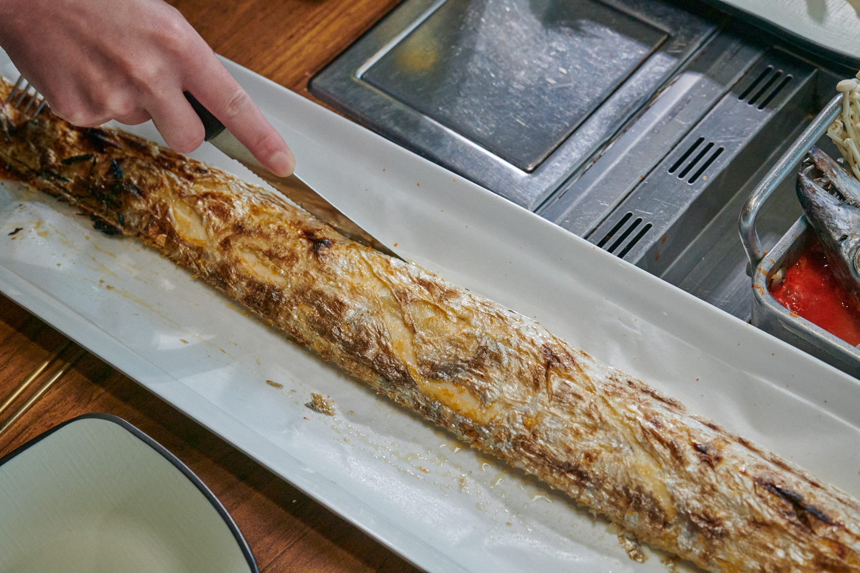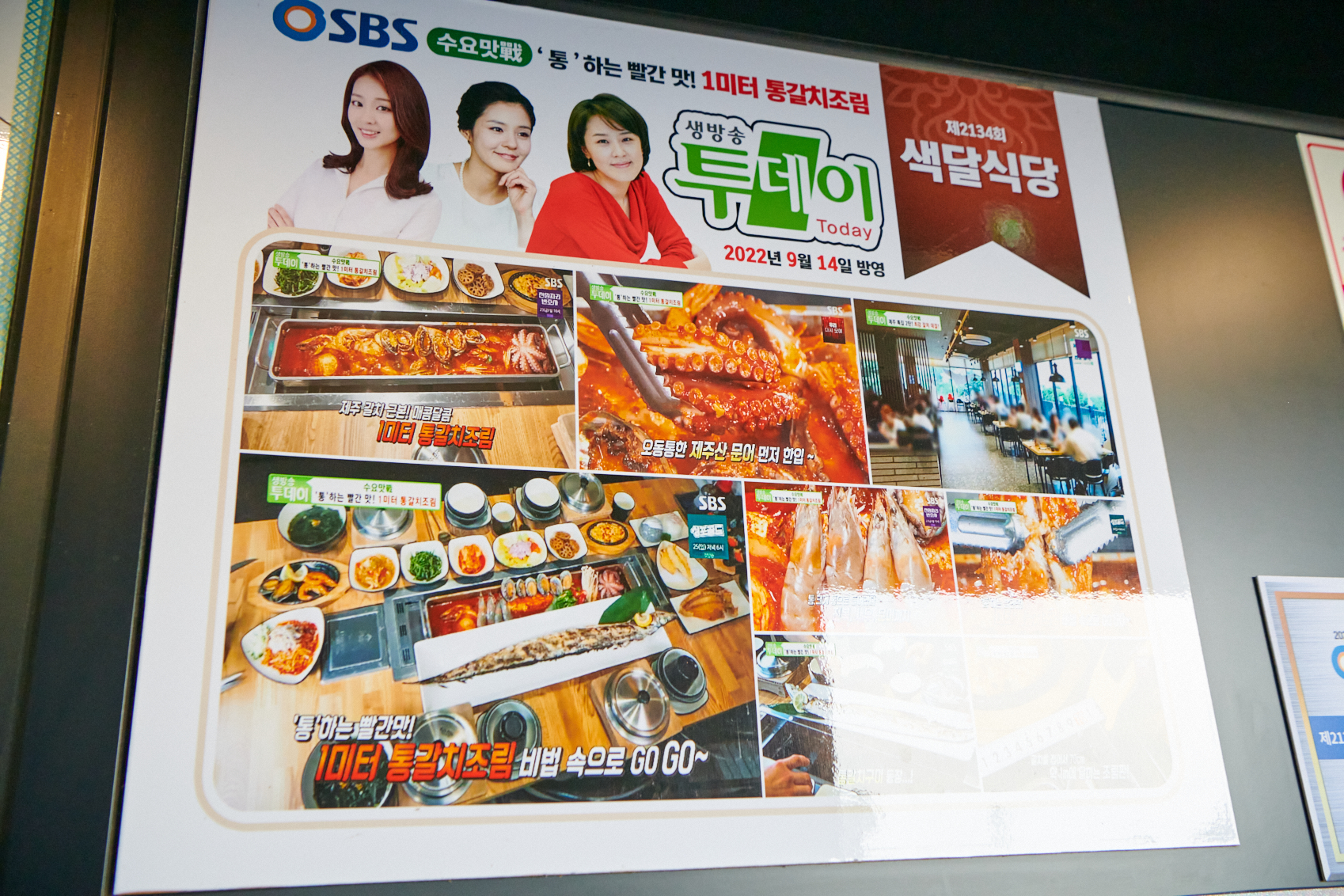 식당 안으로 들어서니 여러 유명인의 방문 사인과 방송 출연 팻말이 눈에 띄었고, 깔끔한 인테리어와 고급스럽게 디자인된 공간이 저를 반겼습니다. 전체적으로 공간이 넓어서 옆 테이블과의 거리가 적당하고, 시끄럽지 않아 편안하게 식사를 즐길 수 있었습니다. 주문은 간편하게 태블릿을 통해 진행했는데, 저희는 4인 분량의 통갈치구이를 주문했습니다.