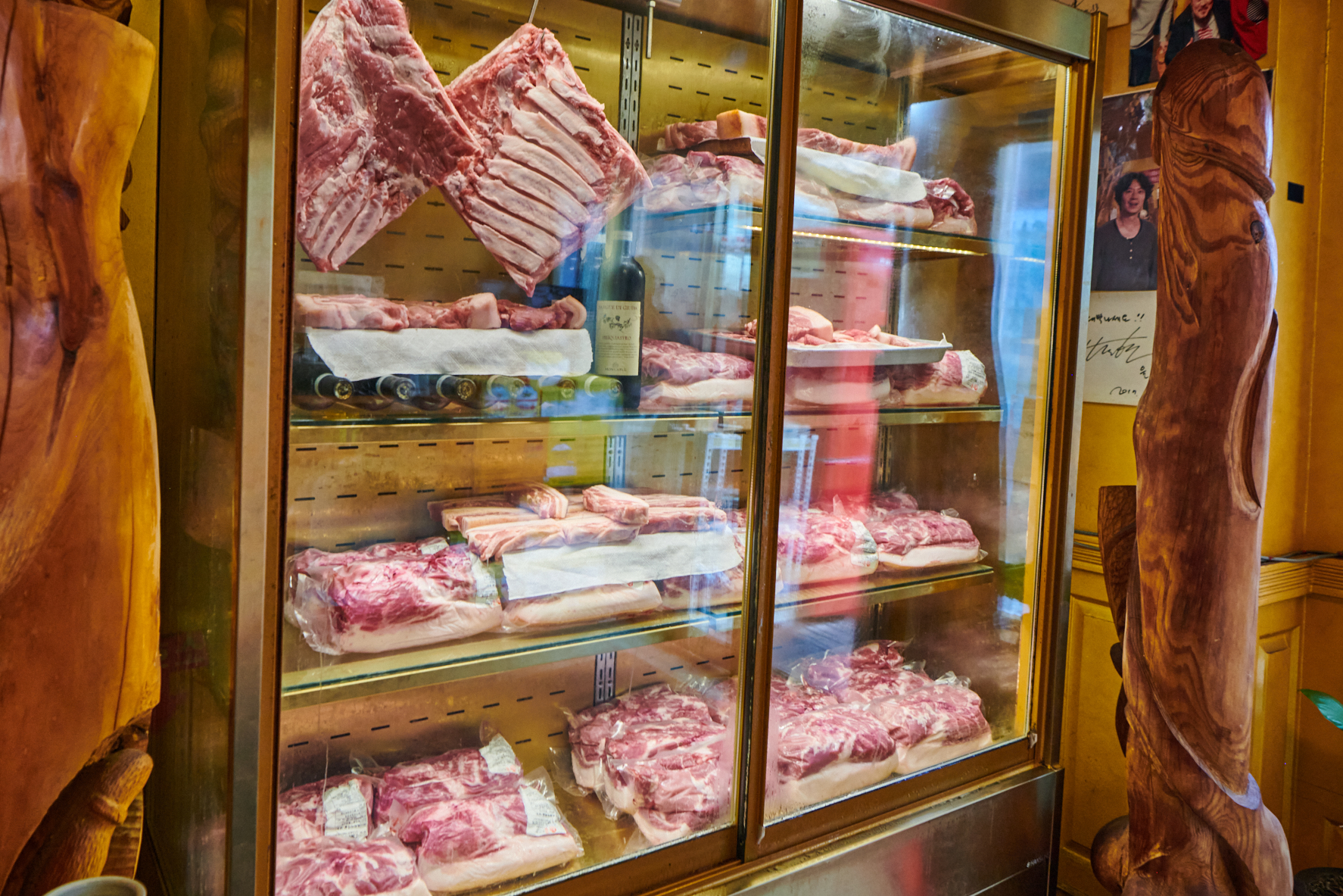 제주 애월 맛집 자리에 앉으니 저 멀리 카운터 옆에 설치된 냉장고가 눈에 띄었어요. 고기와 곁들일 와인, 부위별로 숙성 중인 흑돼지가 맛있게 준비되고 있었더라고요.