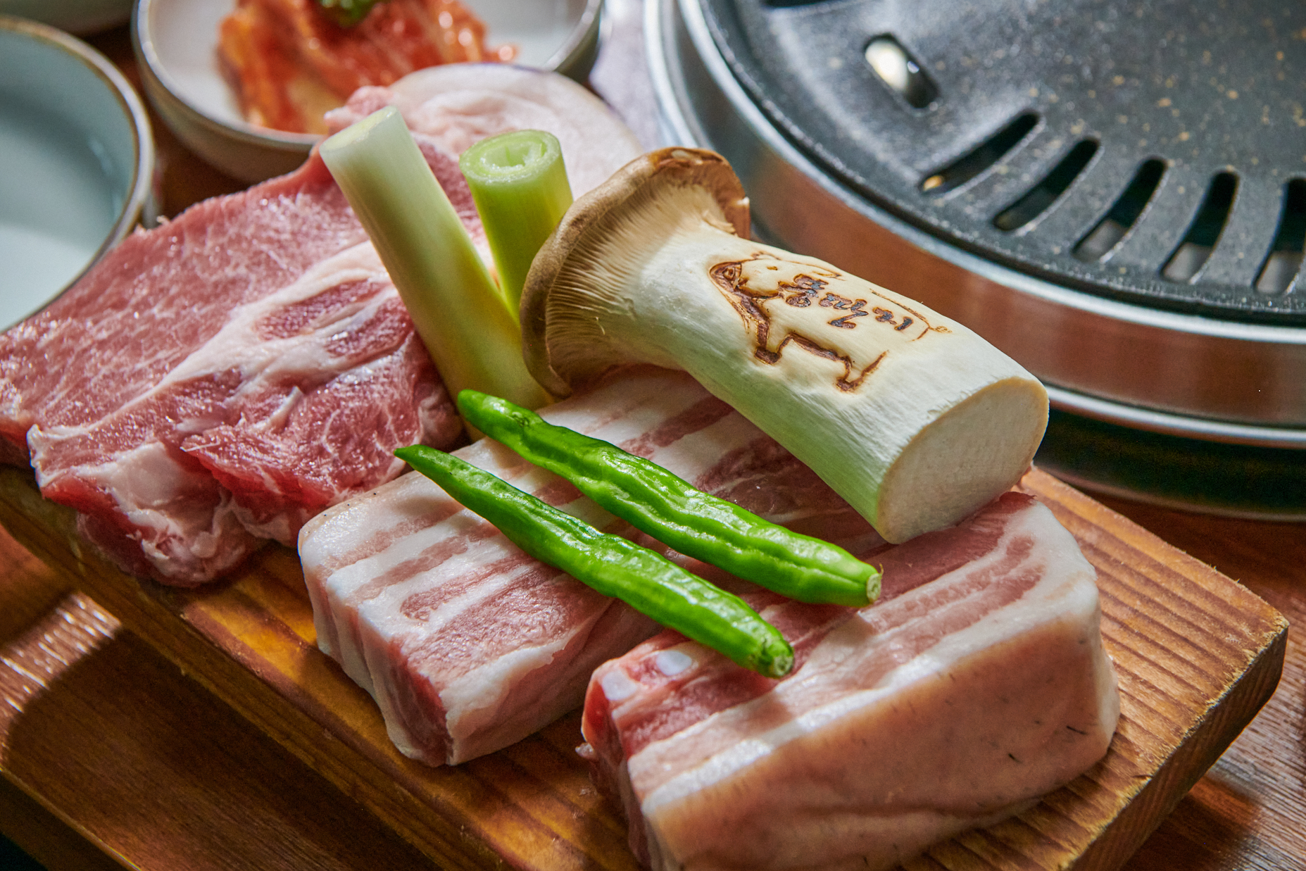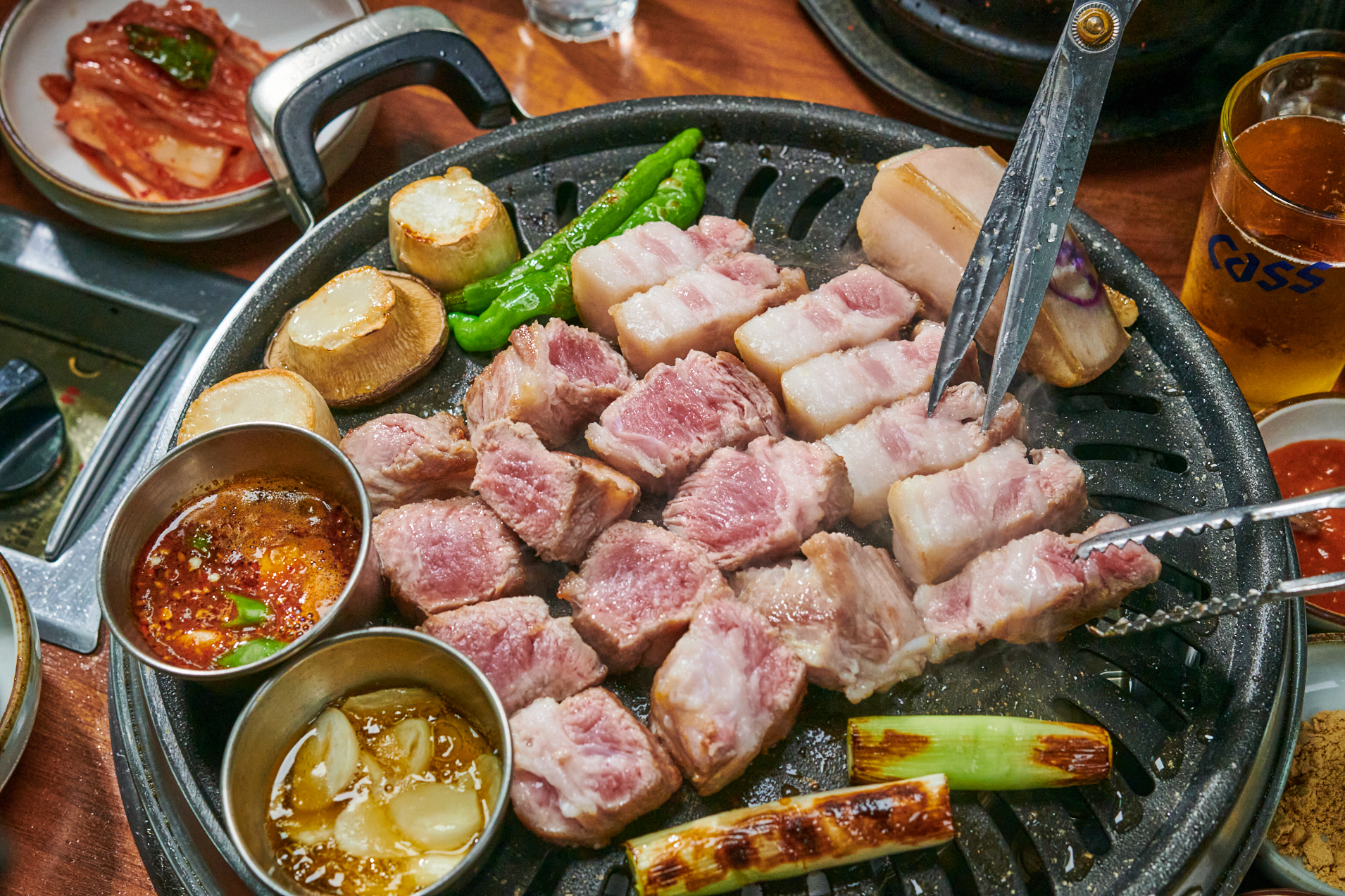 기름 구멍이 따로 뚫려 있는 쇠불판이라서 제주 애월 맛집의 고기를 곧바로 불판 위에 올렸어요. 전복과 새우도 함께 얹어주셔서 한층 더 풍성한 상차림이 되었죠. 특히, 집게로 오겹살을 들었을 때 묵직한 무게가 손끝에서 바로 느껴져서 고기의 신선도를 확실히 알 수 있었어요.