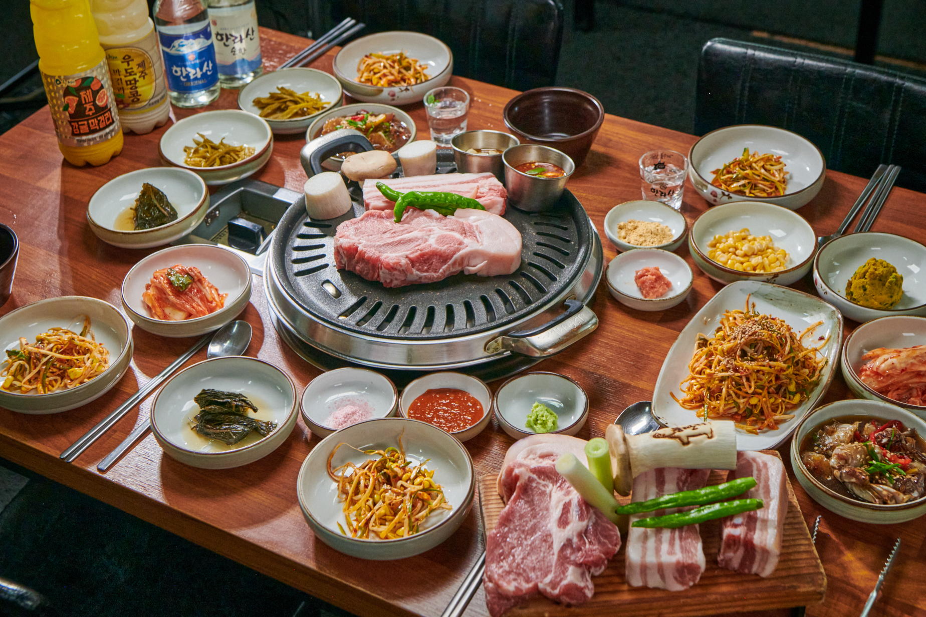 제주 애월 맛집의 오더가 끝나자마자 바로 상차림이 시작됐어요. 콩나물과 파 절임을 비롯해 다양한 곁들임과 앞접시가 정갈하게 세팅되었습니다. 고기는 한눈에 봐도 신선도가 뛰어난 게 느껴졌어요. 제주산 해산물도 함께 제공되면서 먹는 재미가 배가 되었죠. 특히 인원수에 맞게 충분히 제공되어 모자라지 않고 만족스럽게 즐길 수 있을 것 같았어요. 양이 넉넉해서 모두가 배부르게 먹을 수 있을 것 같아 기분이 좋았습니다.