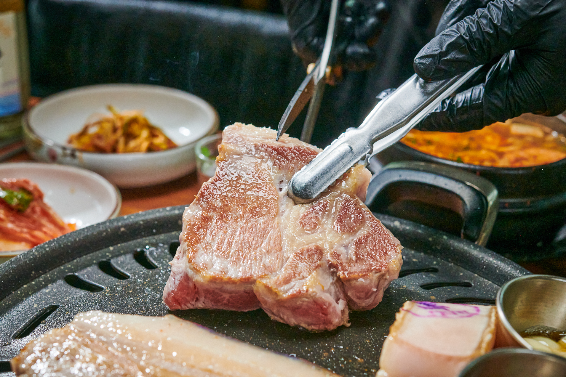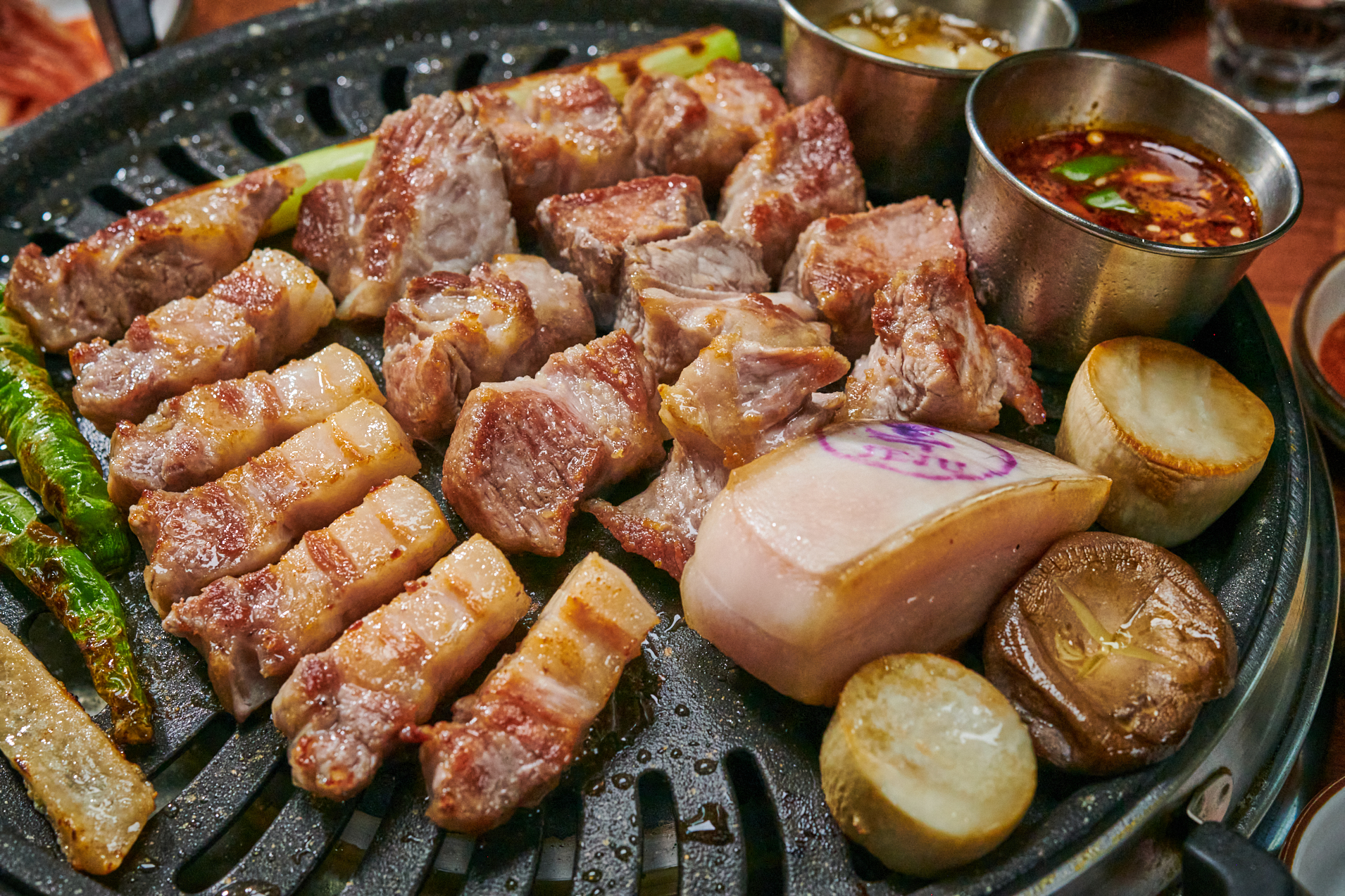 고기의 두께도 두껍고 양도 많아서 정말 만족스러웠어요. 처음에는 지방이 많아 보일 수 있지만, 익히면 아래와 같은 비주얼로 변하죠. 먹기 좋게 큼직하게 잘라서 추가로 먹어도 전혀 질리지 않았어요. 명란소스, 파채, 멜젓과의 조화는 환상적이었습니다. 흑돼지고기의 적당한 기름기와 살코기의 완벽한 밸런스, 이건 정말 최고예요. 안 드셔보신 분들은 꼭 한 번 드셔보셔야 알 수 있습니다!